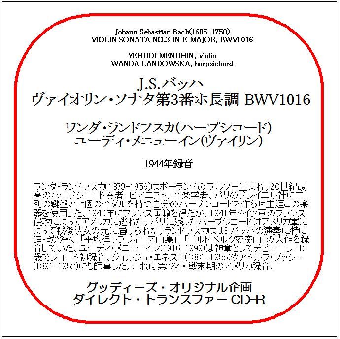 - J.S.バッハ:ヴァイオリン・ソナタ第3番/メニューイン/ランドフスカ/送料無料/ダイレクト・トランスファー CD-R
