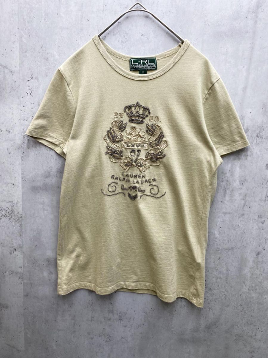 > ゆうパケットOK L-RL LAUREN ACTIVE エルアールエルローレンアクティブ 刺繍 半袖 Tシャツ sizeS/黄土色 ■◆