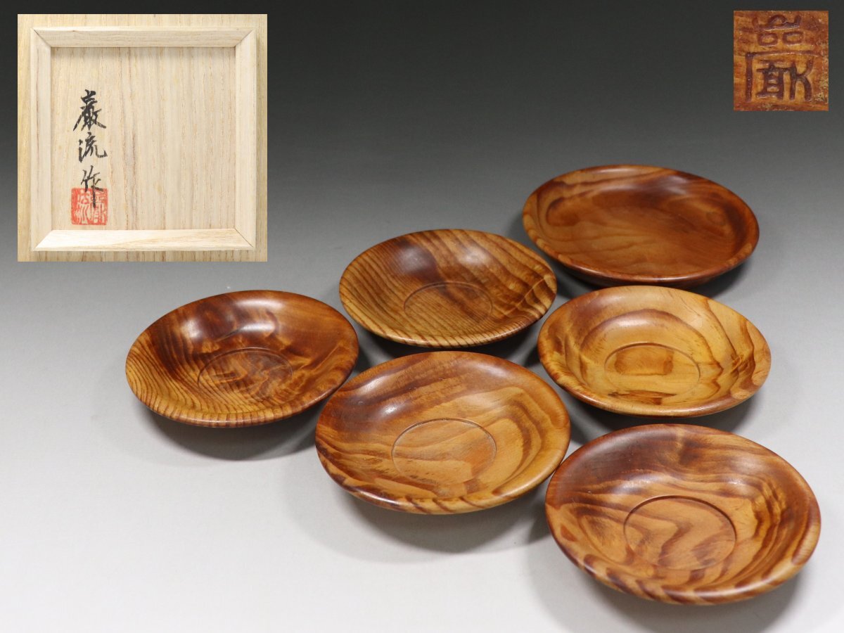 - ◆老松・石井巌流・茶托・5客・急須盆・1客・急須台・瓶座・天然木・茶道具・煎茶道具・共布・共箱◆a6117h