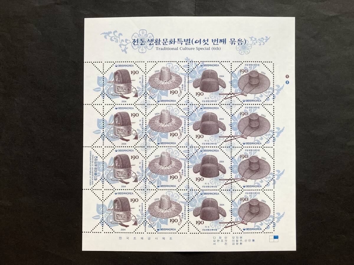 - 外国切手: 韓国切手 「伝統文化特集(6次)」(帽子)16面シート 未使用