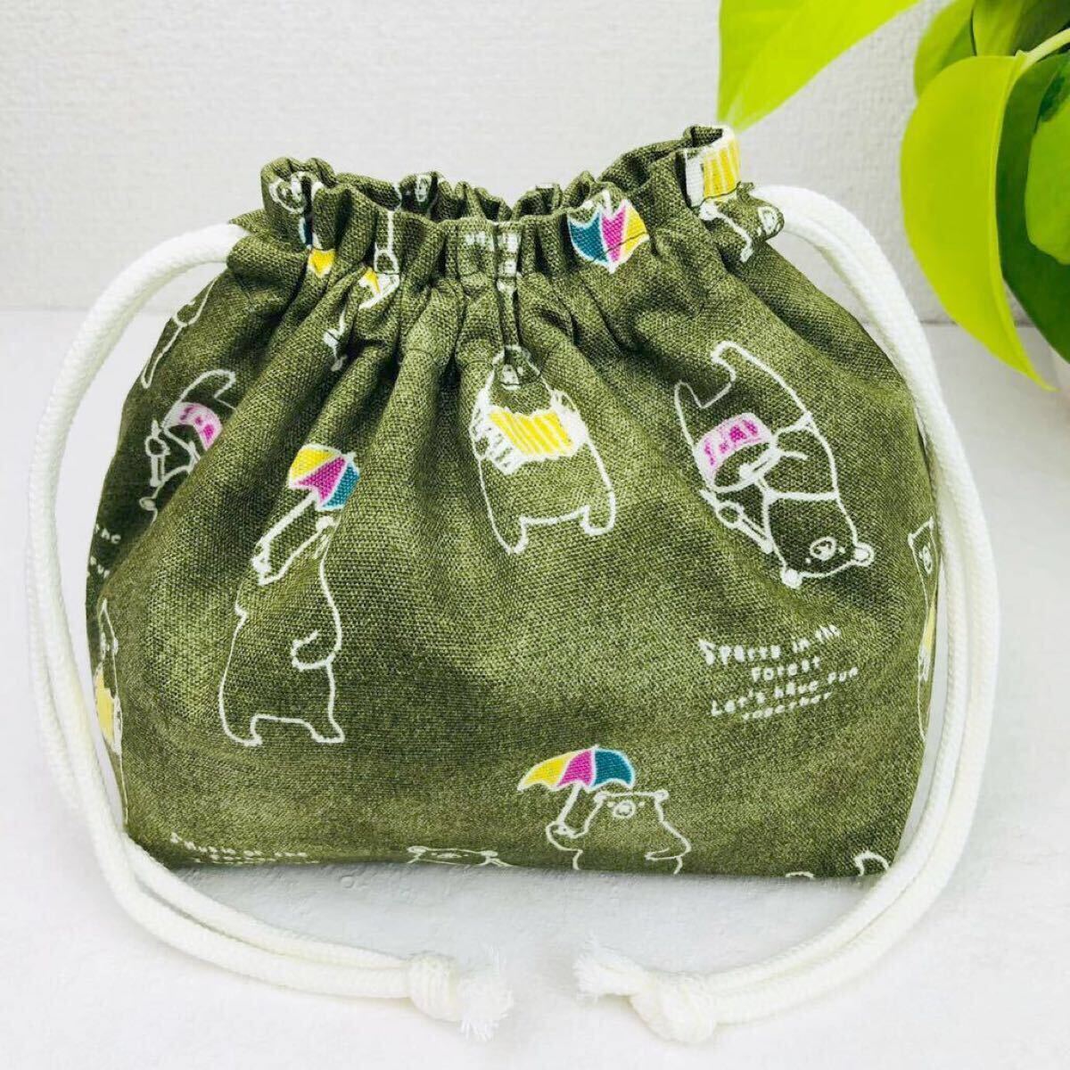 > 裏地付き くまさんのお弁当袋 ハンドメイド 巾着袋 グリーン系 くま柄 ランチ袋