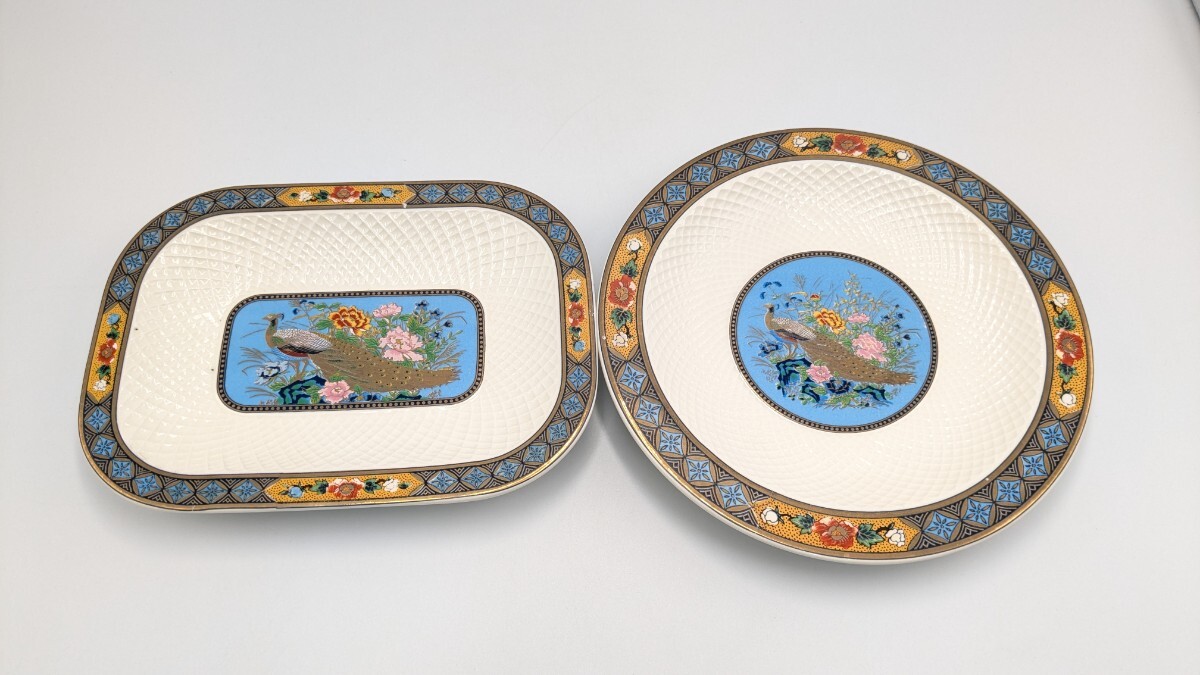 - アンティーク 小皿 飾り皿 和皿 丸皿 角皿 孔雀 2枚セット 水色