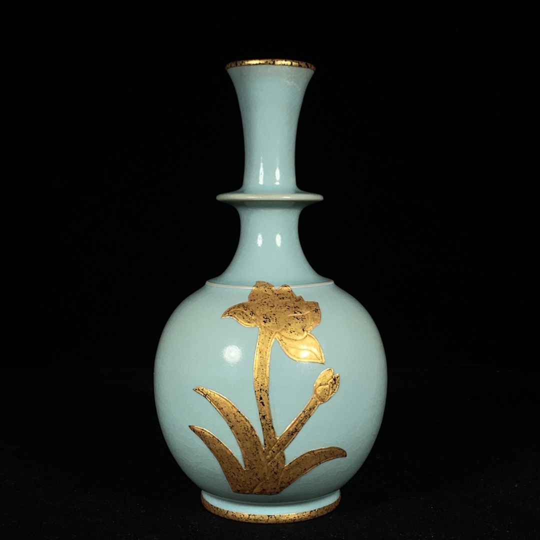 - 蔵友旧蔵出 宋 汝窯 包口 金嵌 花卉紋 淨瓶 古陶瓷品 置物 古賞物 中国古玩 中国古美術品