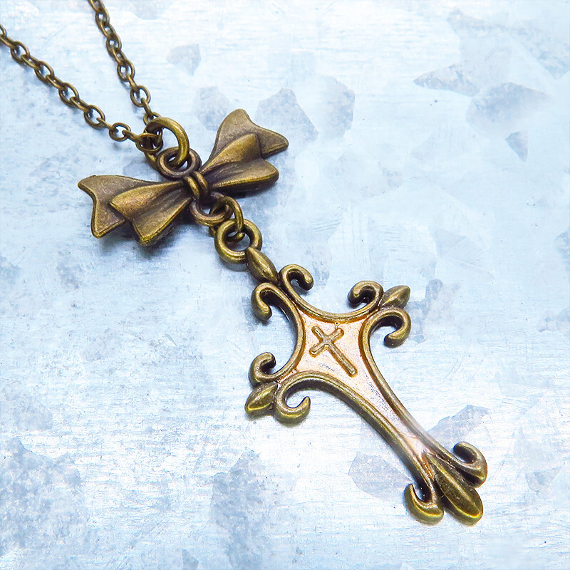 - アンティークゴールド ゴシック調ロザリオとリボンのスリムなネックレス 長さ調整可
