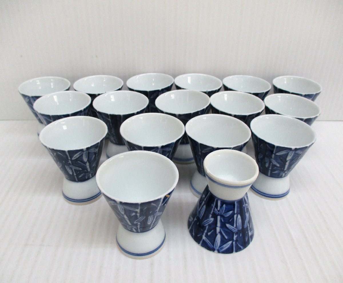 - ★ 92920 お猪口 『 竹 』 ぐい呑み 17個セット 永泉 長期保管品 白地青竹 レトロ 未使用 ★*
