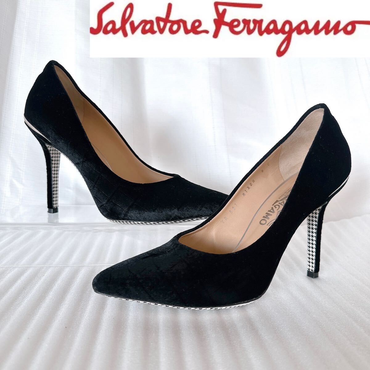 - Salvatore Ferragamo サルヴァトーレフェラガモ ポインテッドトゥ ハイヒール パンプス 黒 極美品 8C レーディス シューズ 靴 千鳥格子