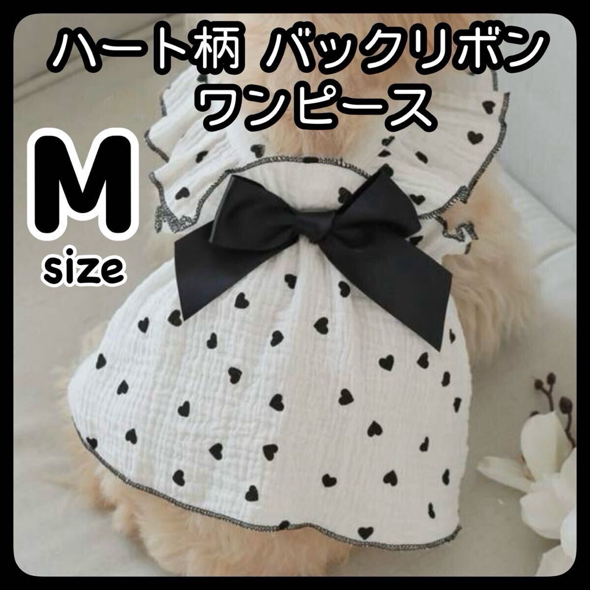 - 小型犬 夏服 ハート ハート柄 袖フリル バックリボン ワンピース ホワイト Mサイズ M