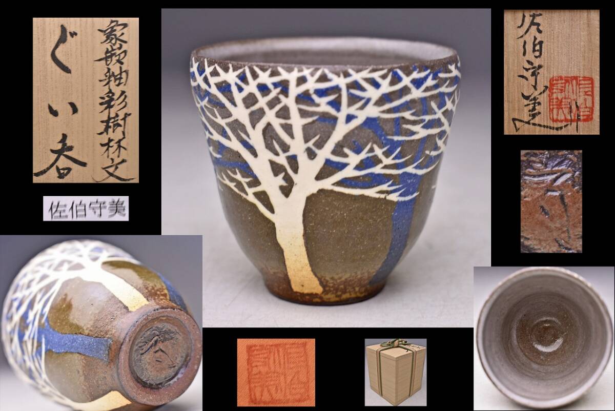 > 佐伯守美 ★ 象嵌釉彩樹木文ぐい呑 ★ 共箱共布栞 ★ 青色の土の象嵌 ★ 人気陶芸家 ★ 酒器 ★ 益子焼