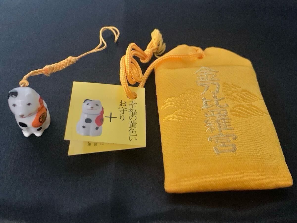 - 幸運の黄色いお守り + ミニこんぴら狗 陶器 狗 犬 金刀比羅宮 御守り お守り 厄除け 魔除け 根付 ストラップ 飾り 開運