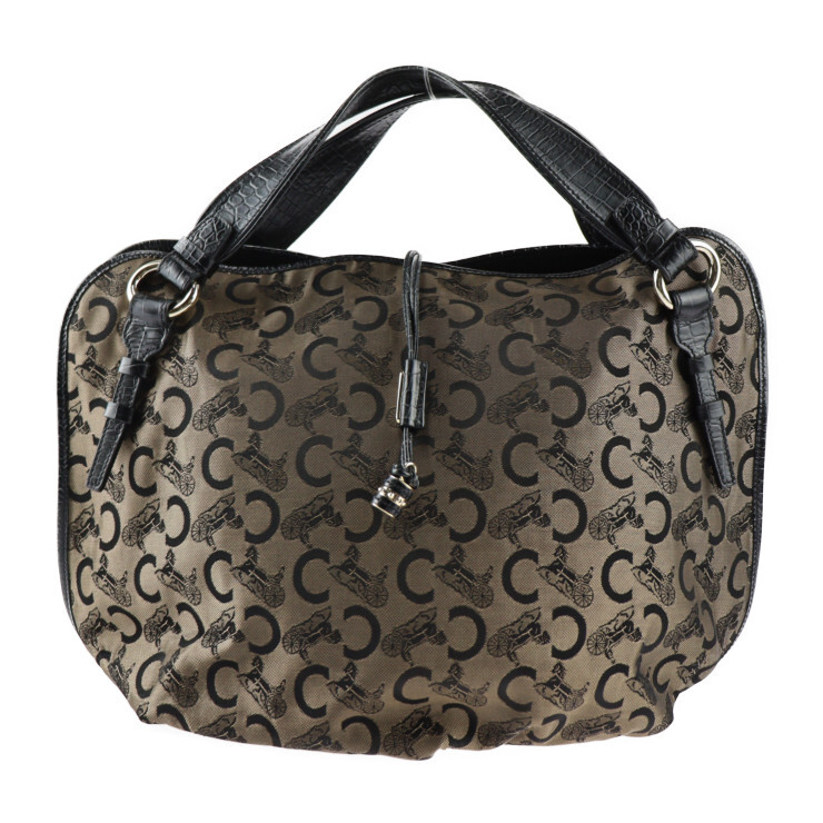 > 美品 セリーヌ ビタースウィート Cサルキー ハンドバッグ キャンバス 型押しレザー ブロンズ 黒 ゴールド金具 ト【本物保証】