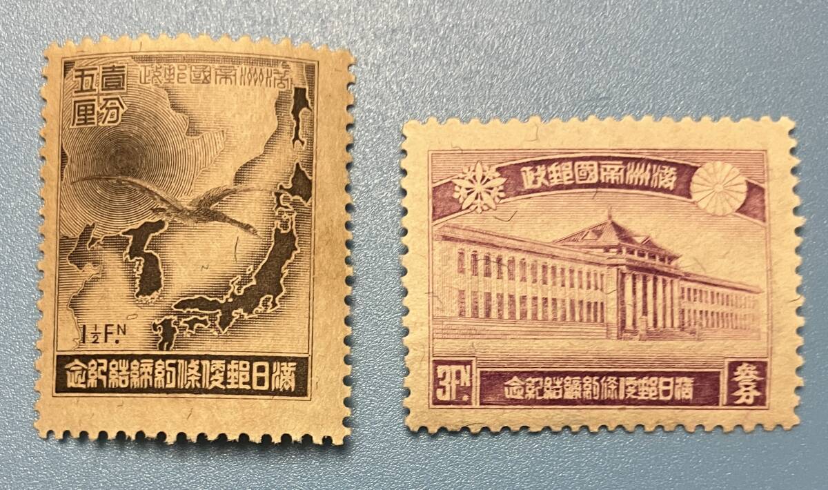 - 満州の切手★ 日満郵便条約 ★1936年発行 1分1/2、3分 変色 丸まり 未使用