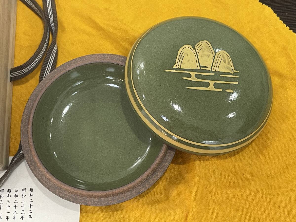 > ★【青磁 香合 合子 香道具 印肉池 茶道具 小物入れ】美濃焼 美濃雅山窯 中島正雄 青瓷金彩 盒子 山水図★未使用品