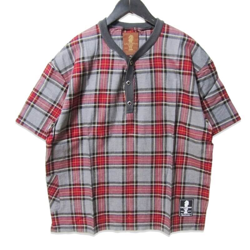 - 美品 California Line カリフォルニアライン 半袖Tシャツ ヘンリーネック チェック コットン 日本製 グレー 赤 36 27109712