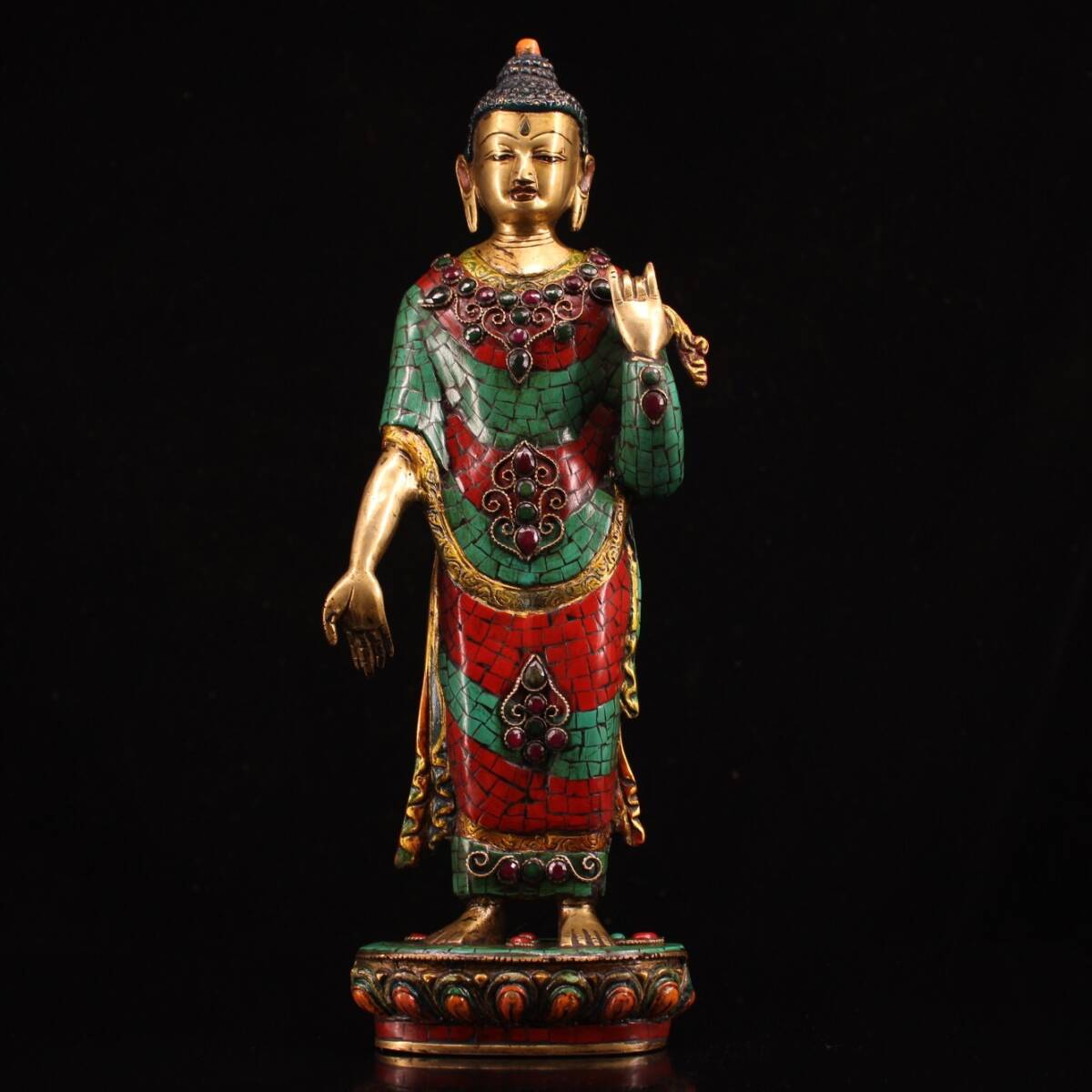 - 『館蔵珍品 銅製 寶石嵌 描金 彩繪 站釋迦摩尼像』仏教古美術 供養品 貴重物品 収蔵品 中国古美術