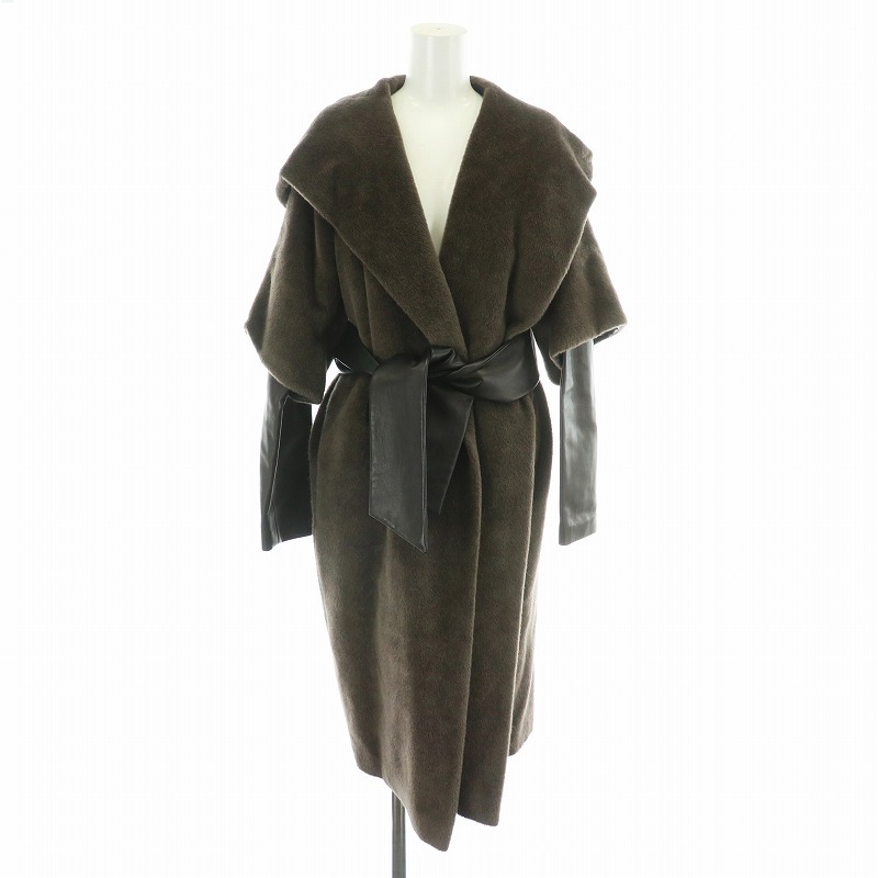 > エルメス HERMES ロングコート アルパカ ウール混 ラムレザー 羊革 レザー切替 ベルト タグ付き 34 XS 茶 ブラウン 黒