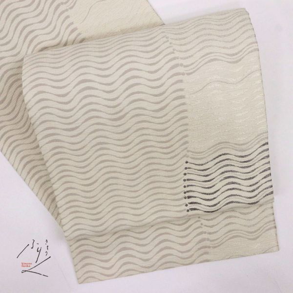 - 【袋帯】 特選 ゆらぎの波縞模様 オフホワイト 六通柄 正絹着物 レディース FH3-11