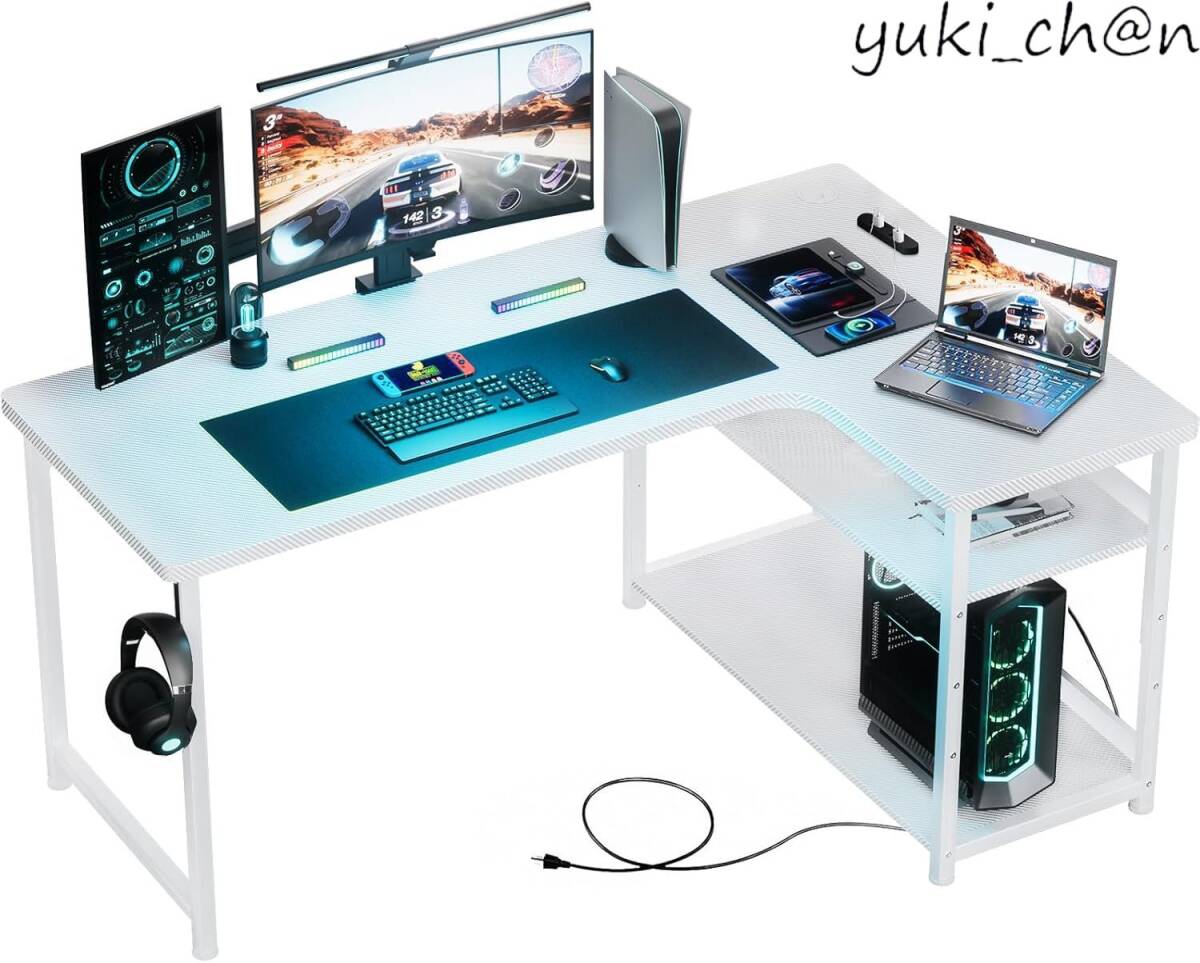 > ゲーミングデスク パソコンデスク L字 カーボン調 コンセント付き ラック付き モニターアーム対応 右棚 79奥行き×110幅×74.5高さ 白