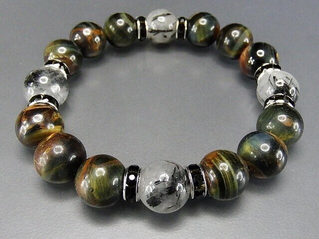 - 天然石ミックスタイガーアイブラックルチルクォーツ12mmブレスレット仕事運事業運プライム