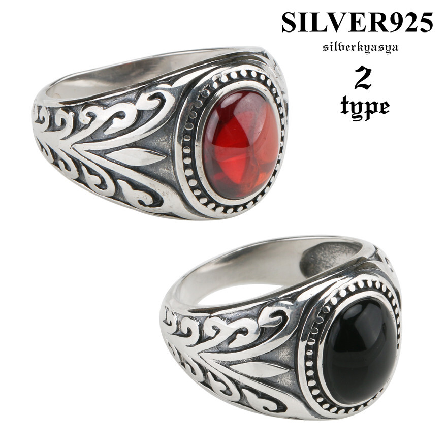 - (ブラック、15号) シルバー925 唐草 カレッジリング シルバーリング ストーン リング ブラック レッド ガーネットリング