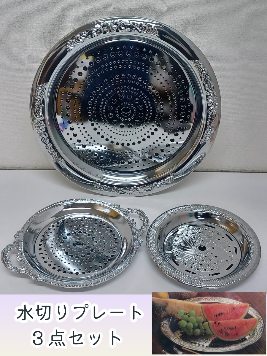 - 岩)水切りプレート3点セット トレイ ステンレス 円形 フルーツ盛り皿 水切りプレート プレート 喫茶店 オードブル 水切盆 250522(I-1-1
