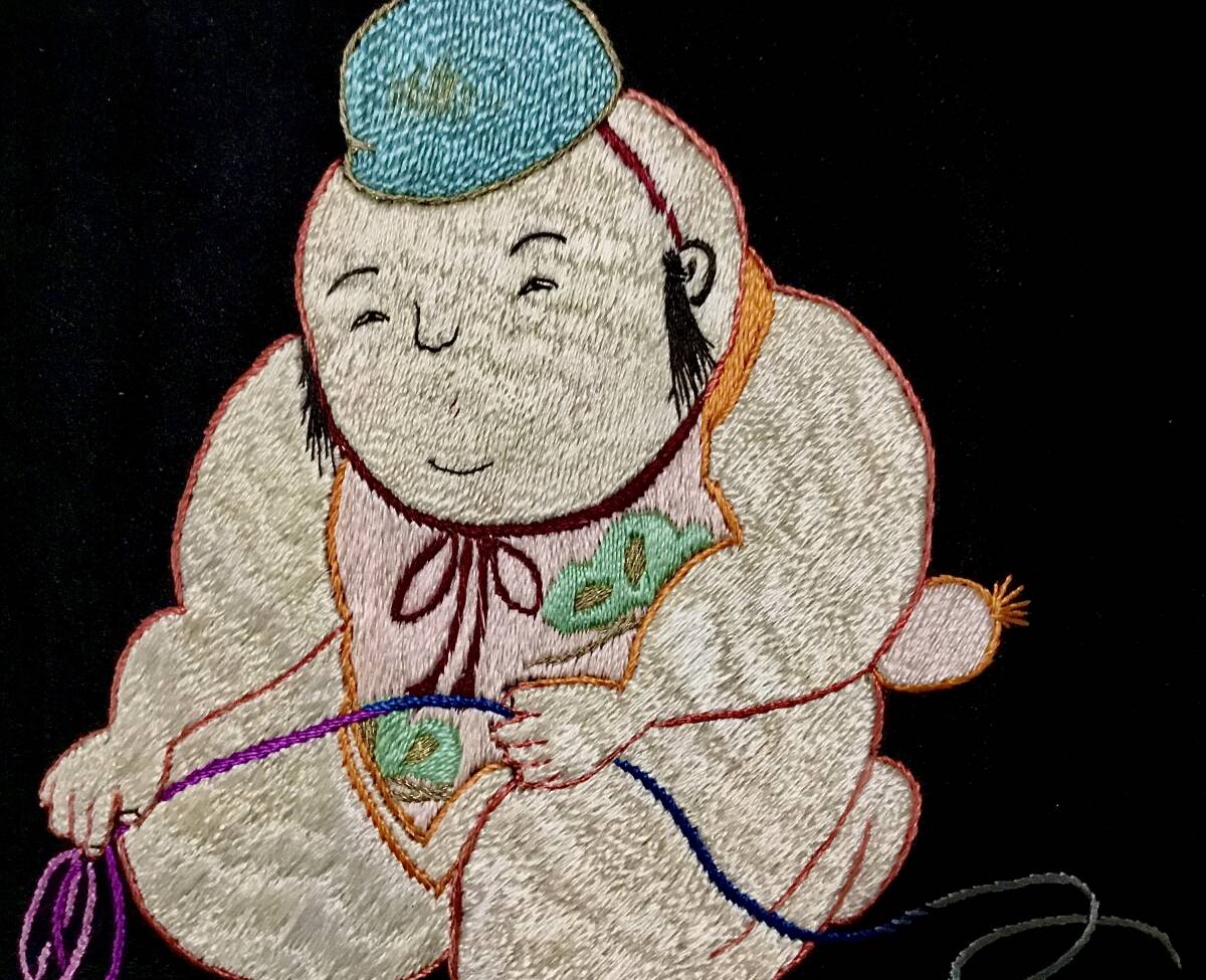 - 古布773 古布ハギレ2枚・絹(刺繍の童子15x15・茶道具21x32)・時代着物地