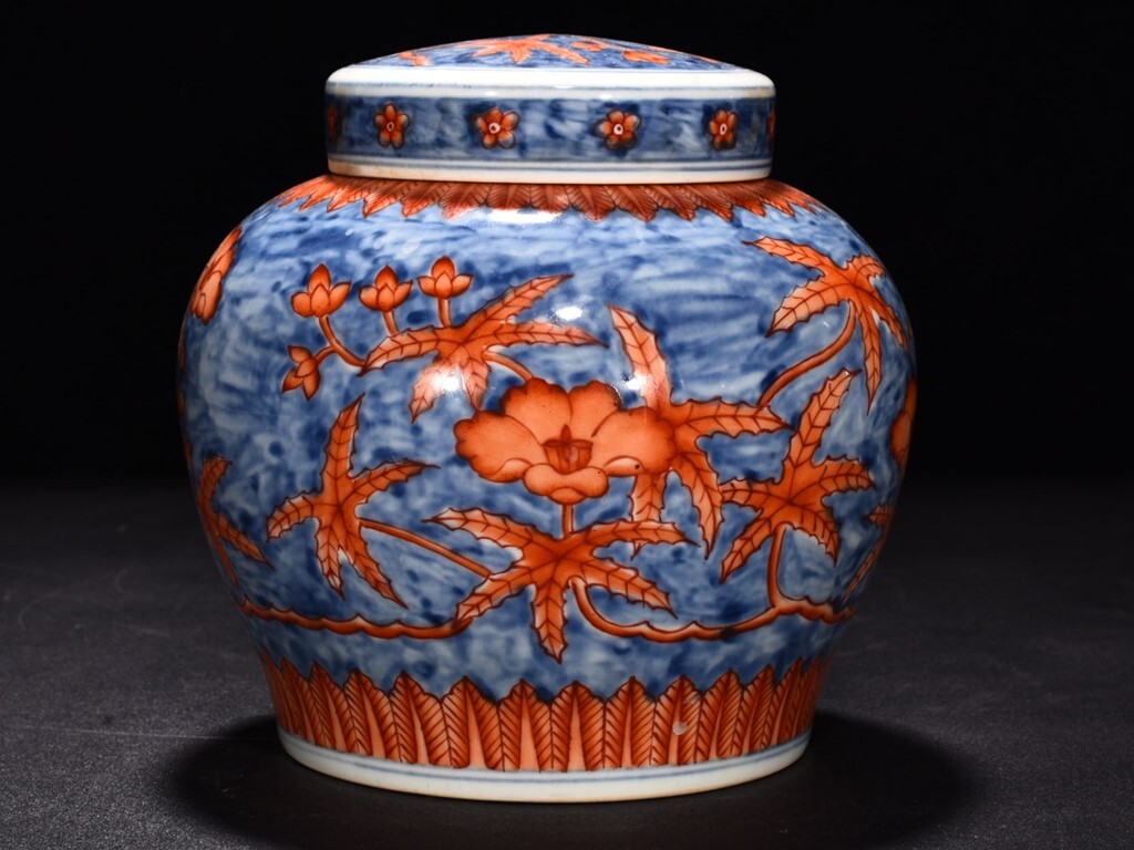 > TB107■中国古玩 唐物 明成化 青花礬紅花卉紋蓋壺 時代物 極上品■ 高さ15cm・直径16.5cm■