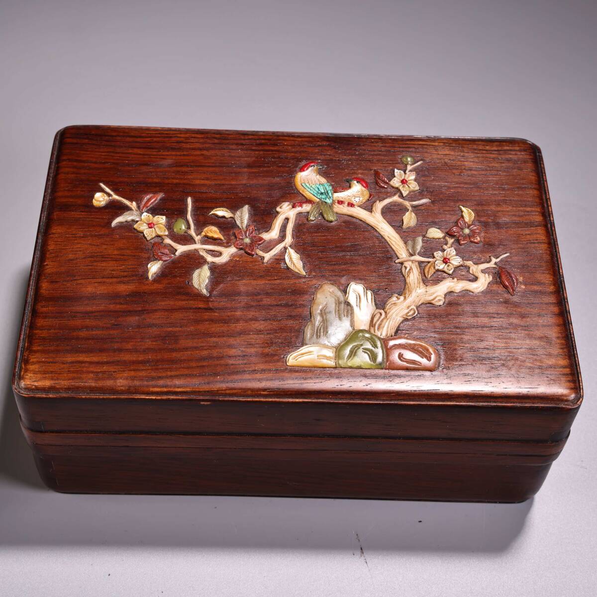 - 蔵友旧蔵出 花梨木製 細密彫 多寶嵌 喜上眉梢紋 首飾盒 置物 古賞物 稀少珍藏品 中国時代美術品