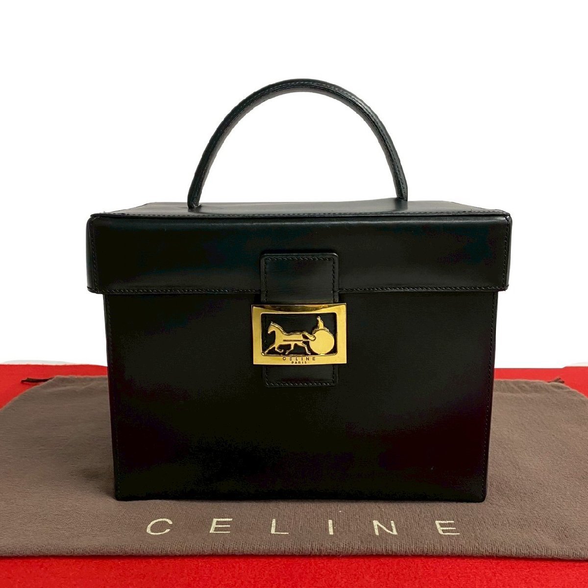 - 極 美品 CELINE セリーヌ ヴィンテージ ロゴ 馬車金具 カーフ レザー 本革 ハンドバッグ バニティバック メイクボックス ブラック 35733