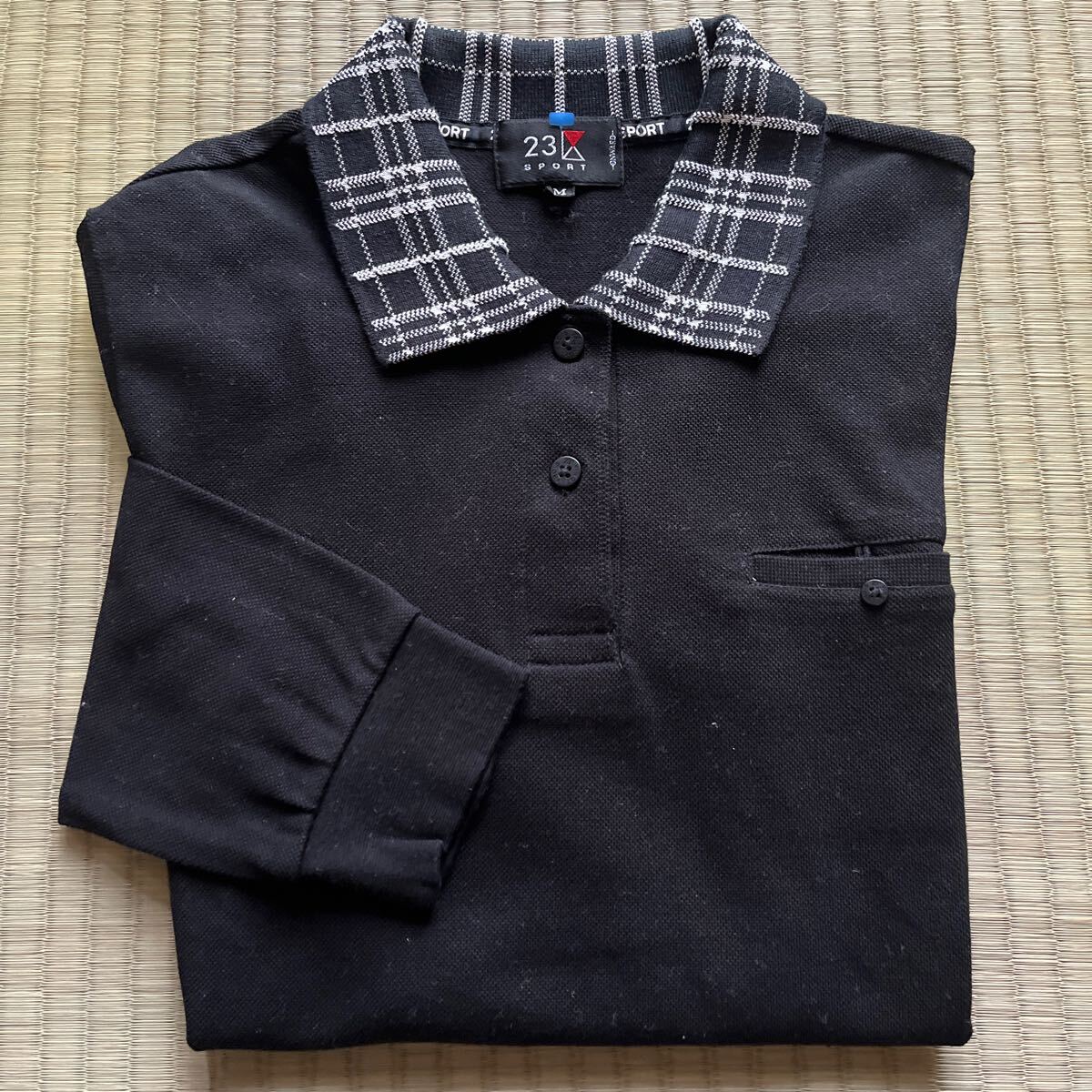 - 新品★23区 スポーツ 23区SPORT★M ポロシャツ 長袖 綿100% 襟チェック柄 黒 ブラック ゴルフウェア オンワード樫山 胸ポケット トップス