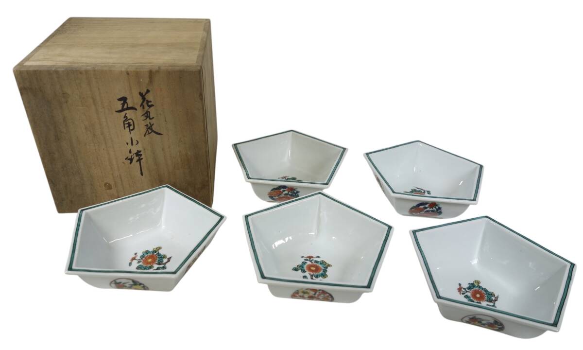 > 昭和ビンテージ 九谷美陶園 九谷焼 手描 花丸紋五角小鉢 5客セット 木箱付 1960〜1970年代 KSN705