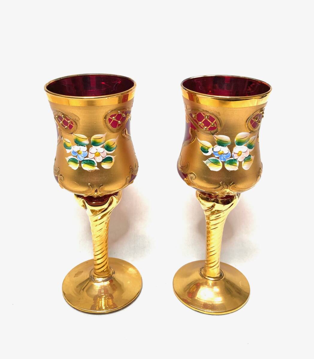 - 【B】【17130】★☆ベネチアン ガラス ワイングラス レッド / ゴールド 2客 ペア 金彩 花柄 洋食器 現状品☆★