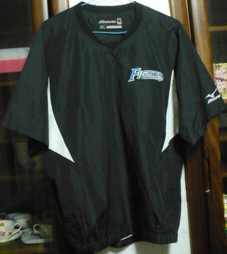 - 美品 MIZUNO【ミズノ(株)】製北海道日本ハムファイターズプルオーバー半袖ジャケット?Vジャン練習着? M 黒×白
