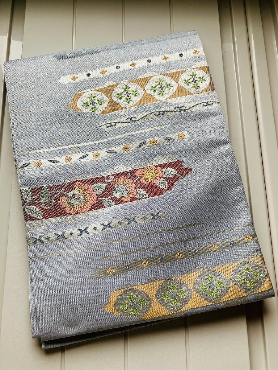 - 名古屋帯 上品な柄 草花文 灰色系 グレー系 正絹 幅約30cm 着物帯 TCS着物 W16