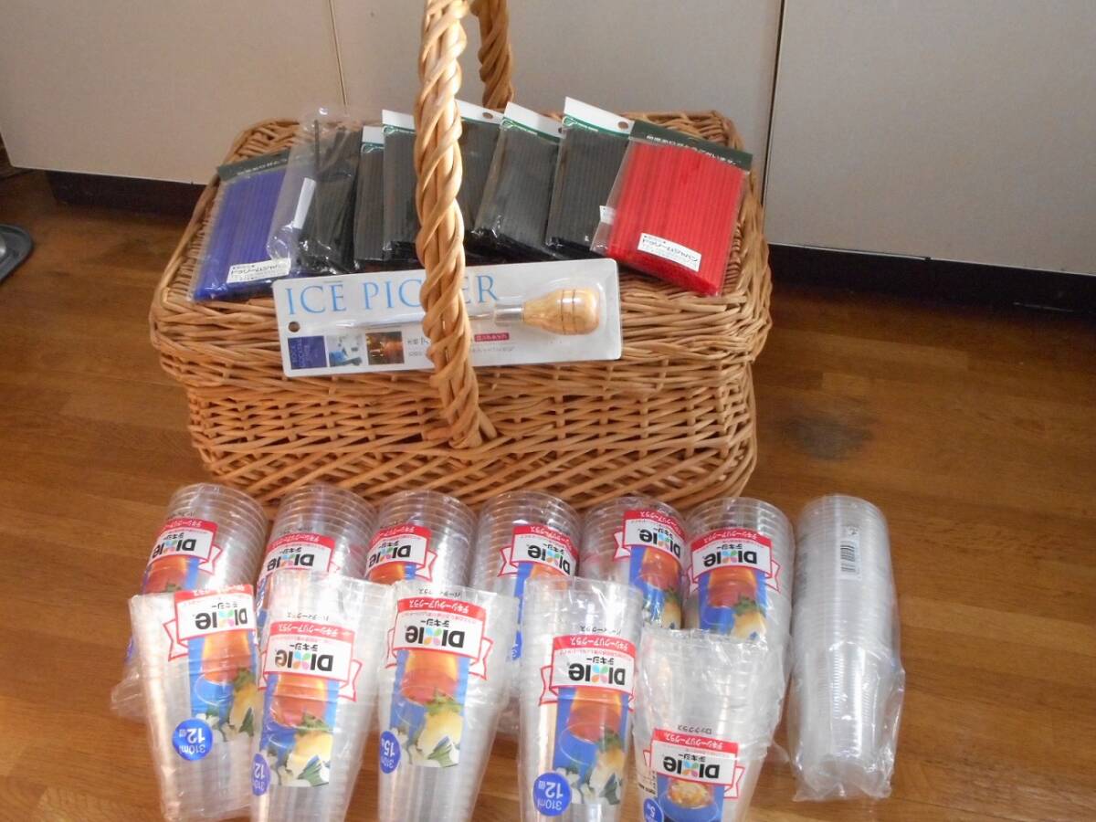> 藤バスケット 内かご(仕切り有)付き ピクニック BBQなどに プラカップ,ストロー多数付属 持ち手あり 裁縫箱 USED