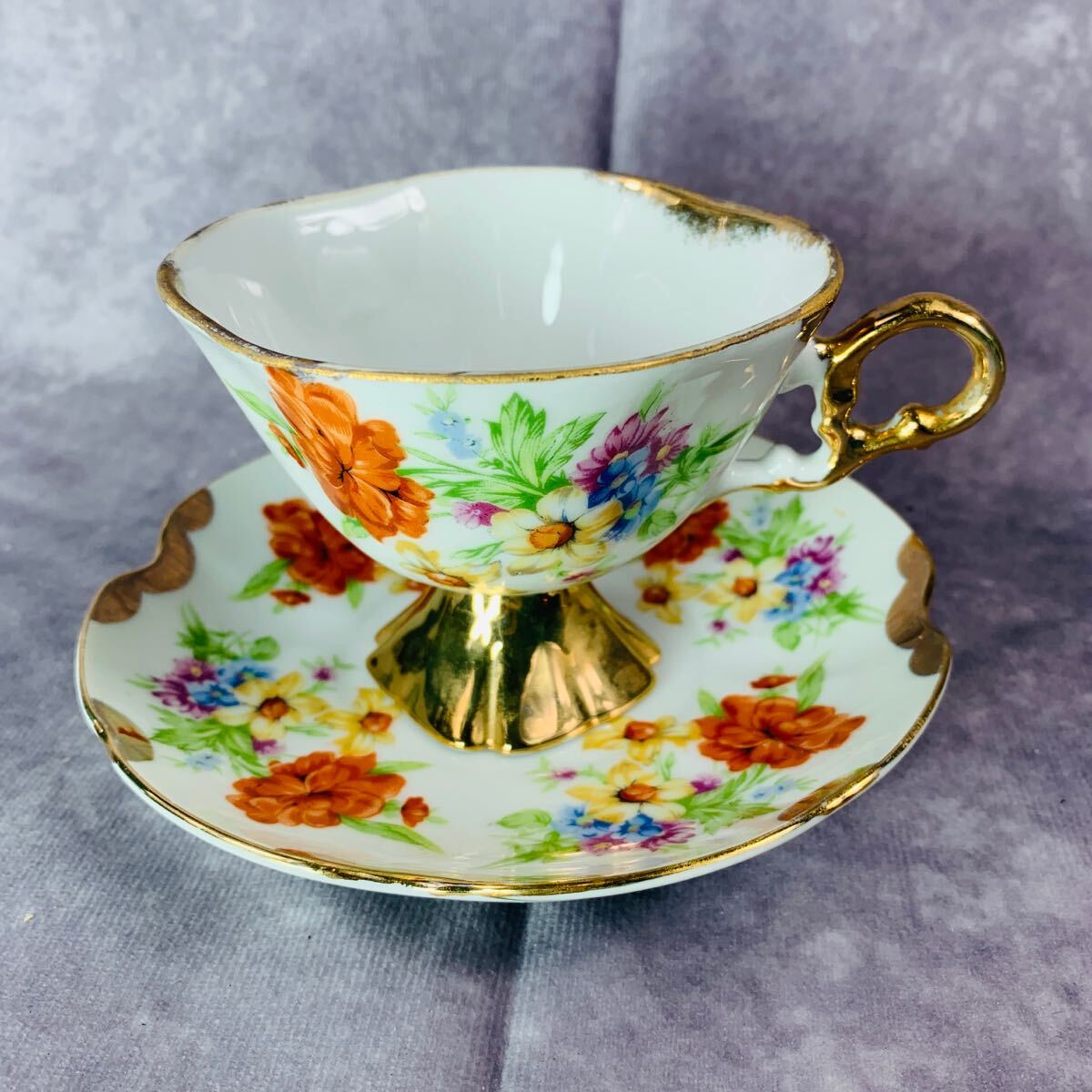 > 明治大正期 輸出用 オールドニッポン カップ ソーサー アンティーク 金彩 透かし彫り ティーカップ ハンドペイント オキュパイド