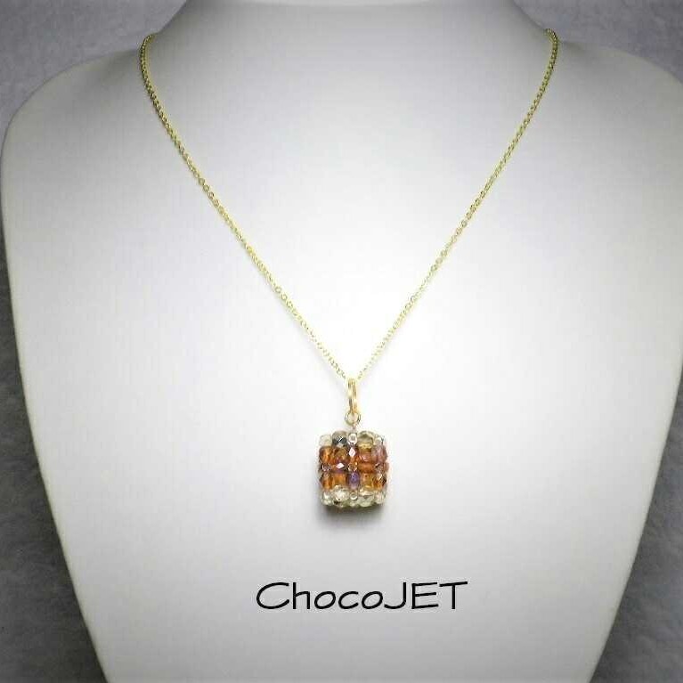 - シンプル・ビーズ・キューブネックレス ブラウン・ゴールド・クリスタルビーズ 金茶