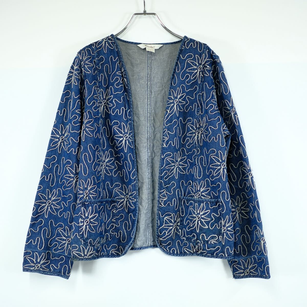 > 1990s ビンテージ ステッチワーク 花柄デニムジャケット ノーカラー 古着屋 アート 刺繍 総柄 ショート丈 デザイン