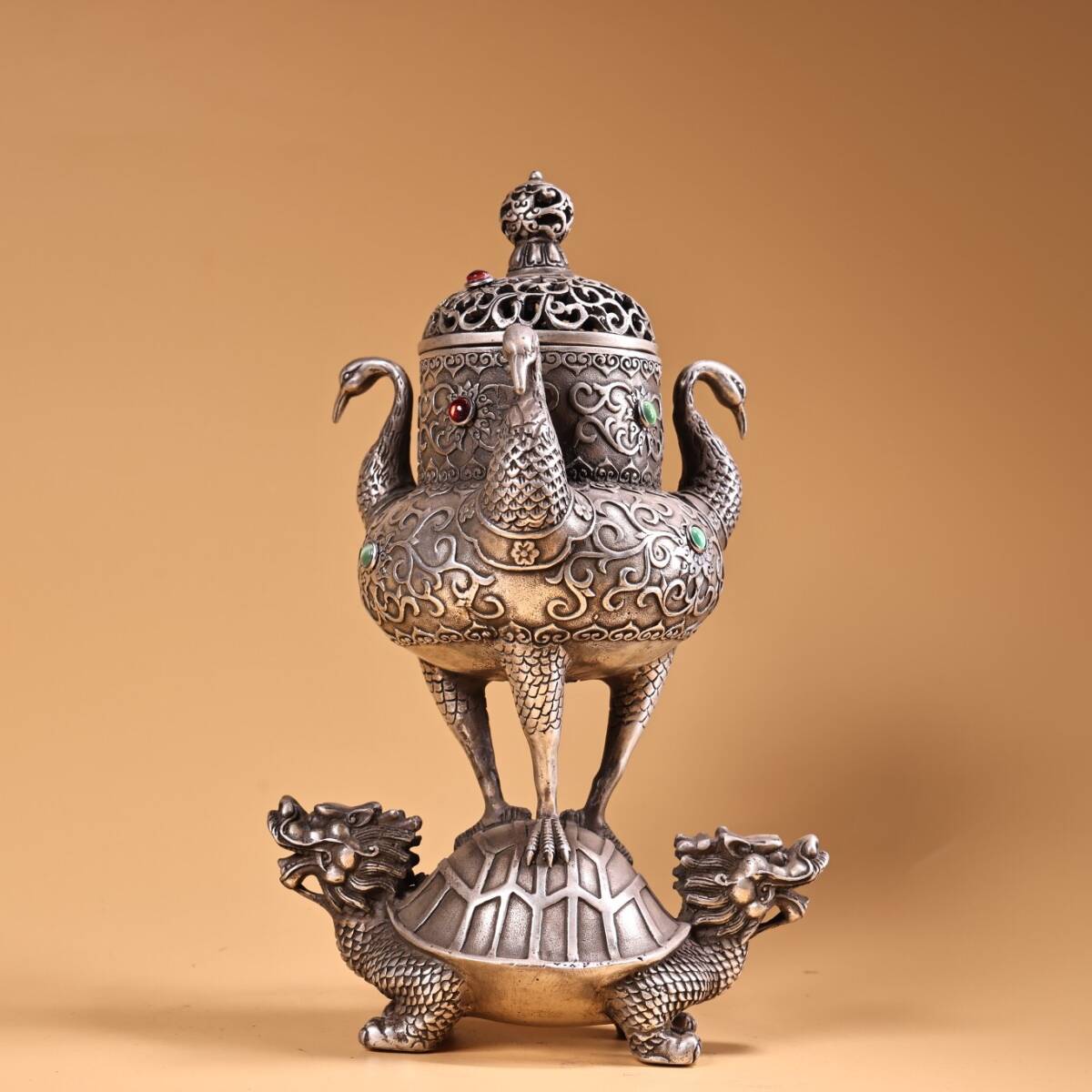 - 蔵友旧蔵出 銅製 銀鍍 寶石嵌 龜鶴熏香爐 貴重品 置物 古賞物 密宗密教 供養品 仏教美術品