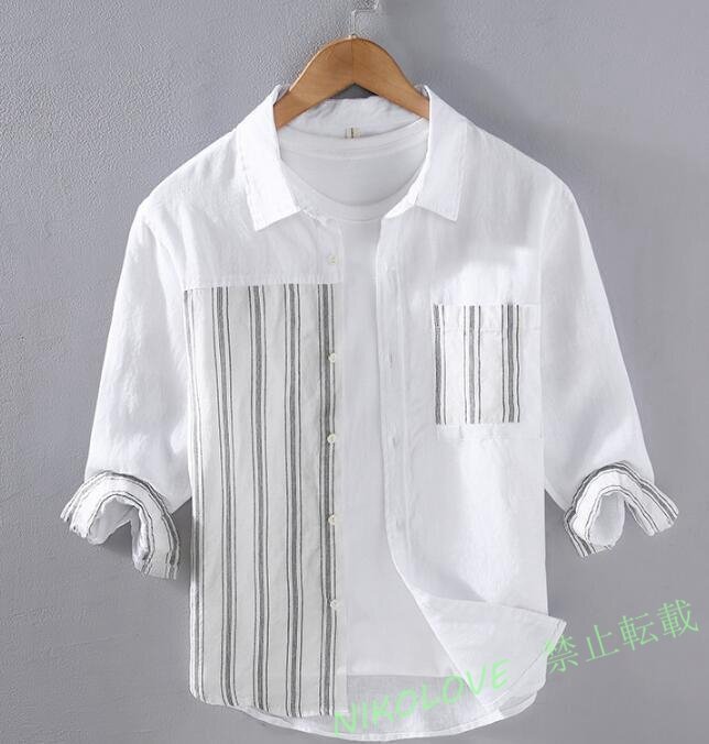 - 新品 リネンシャツ 七分袖シャツ 夏 ワイシャツ 切替 ストライブ柄 亜麻 麻シャツ 夏 サマー カジュアル 心地良し 清涼感 通勤 LH261