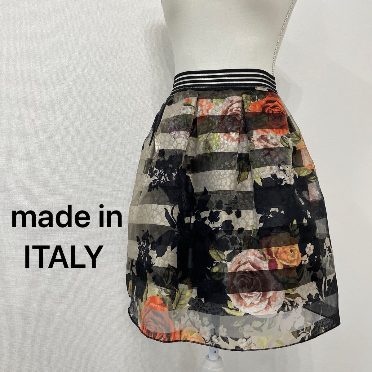 - 【408】イタリア製 花柄スカート 個性派 ボーダー シフォンスカート フラワープリント 透け感 シースルー バルーン型 形可愛い