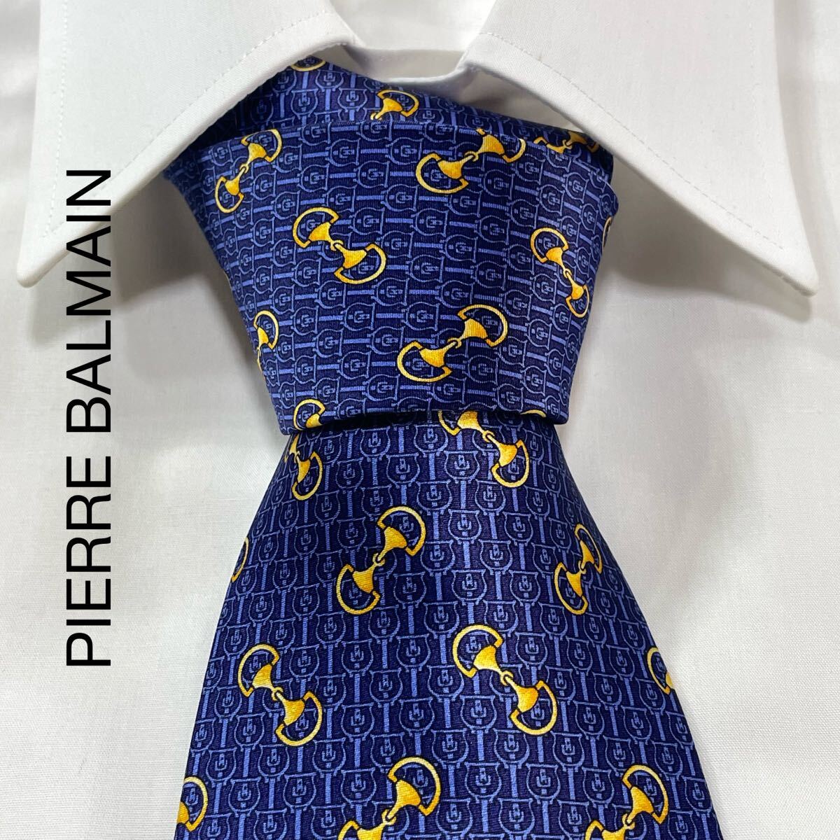 > 美品 PIERRE BALMAIN ピエールバルマン パターン柄 シルク ネクタイ フランス製 ブルー ネイビー イエロー TG1925
