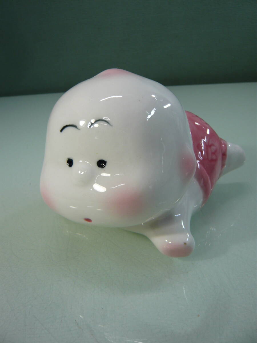 - 陶器 貯金箱 はいはい赤ちゃん 花無しピンク小 中古 昭和レトロアンティーク 当時物