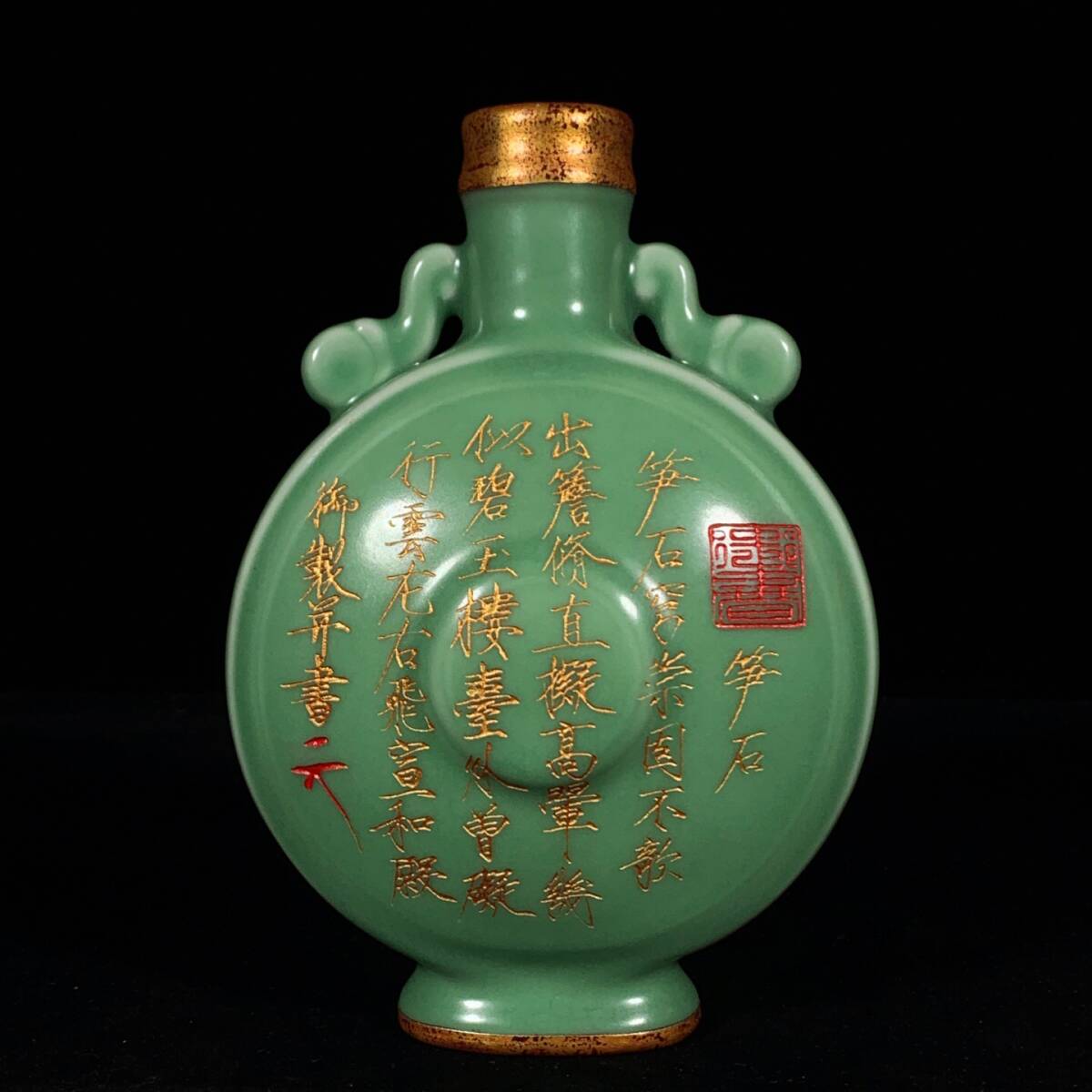- 蔵友旧蔵出 宋 龍泉窯 梅子青釉 包口 銘文 雙耳扁瓶 稀少珍品 貴重品 古陶瓷品 置物 古賞物 中国古玩 中国古美術品