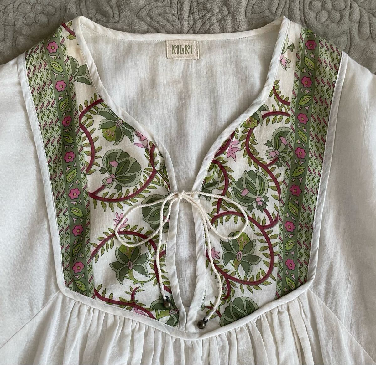 - kilki 花柄 ワンピース エスニック 緑 アイボリー ピンク 黄緑 綿100% リボン コットン 長袖 プルオーバー キルキー インド製