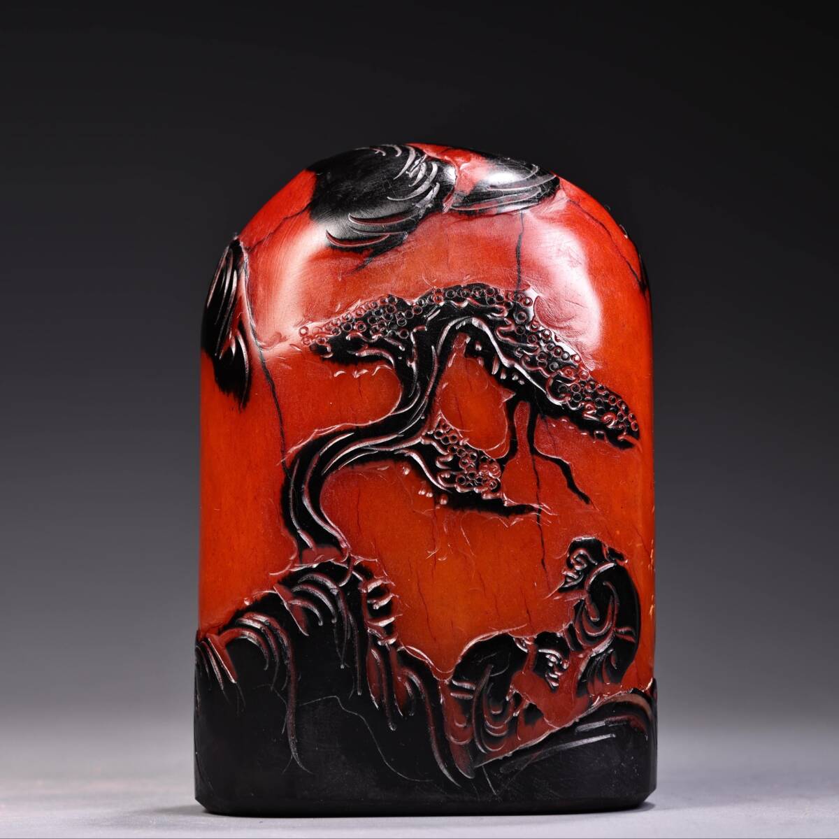 - 蔵友旧蔵出 寿山石 烏鴉皮 紅田黄石 細密彫 鬆下老人紋 印章 箱付 貴重品 稀少物品 置物 賞物 中国時代美術品