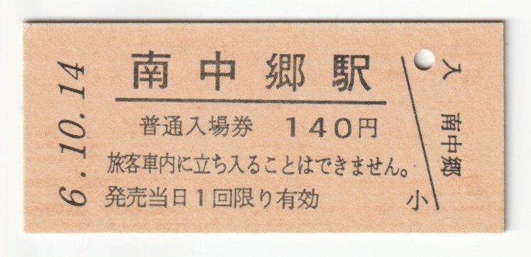 - 平成6年10月14日 常磐線 南中郷駅 140円硬券普通入場券(日付印刷)