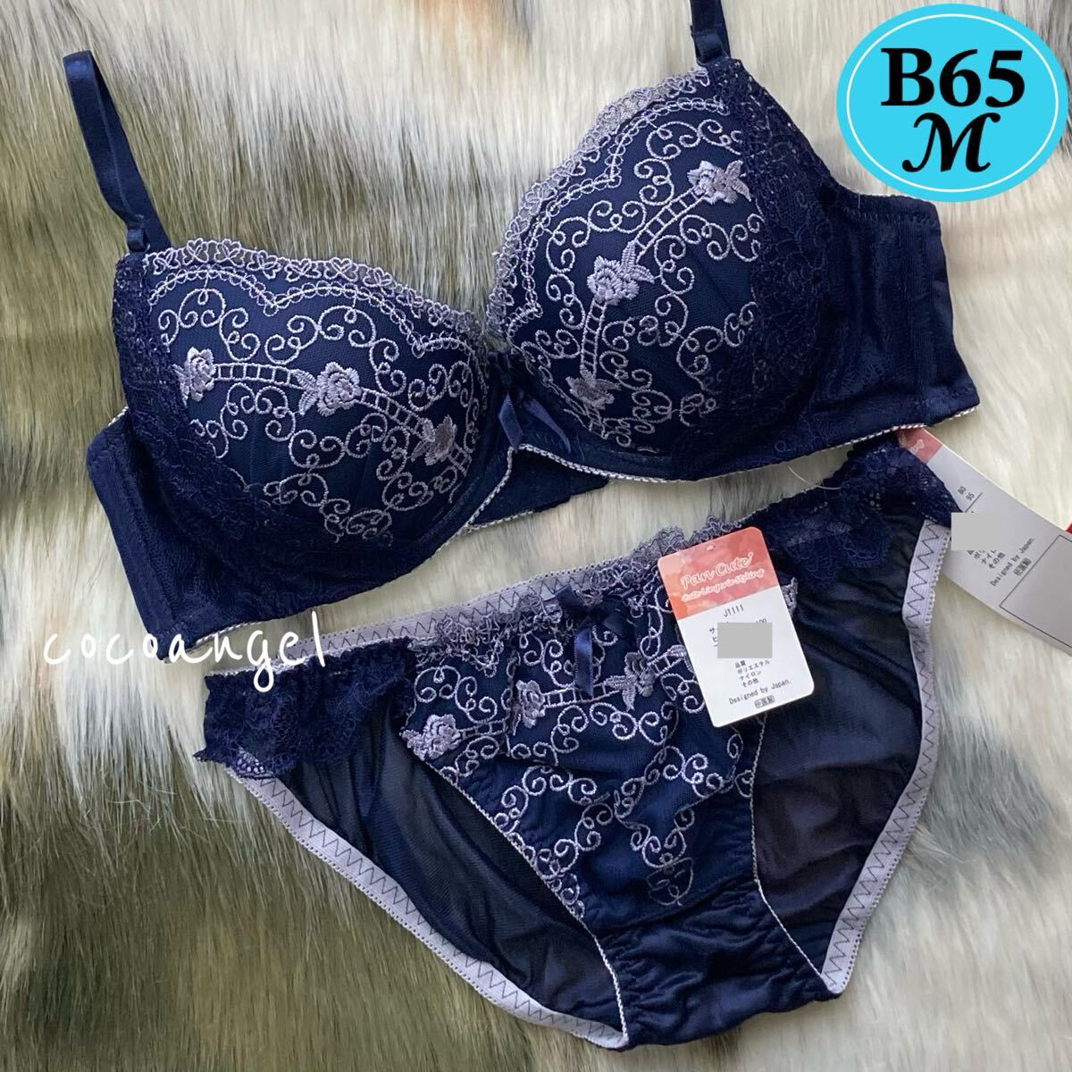 - ラスト【B65/M ネイビー 上下】新品 ブラ&ショーツ ブラジャーショーツ パッド内蔵 バラ刺しゅう 透けパンティ 小さいサイズ Bカップ