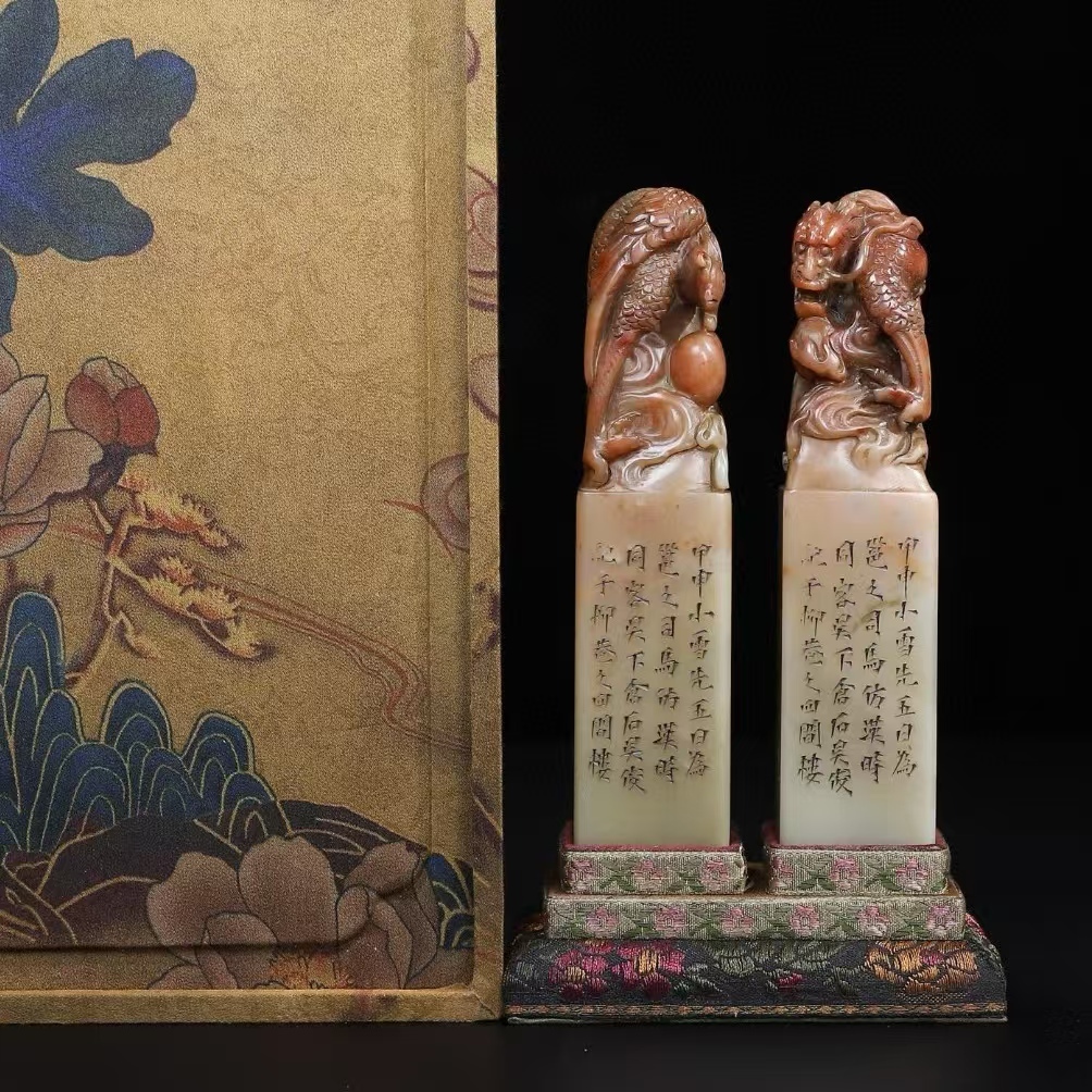 > 秘藏 清代 寿山石印章一式。『龍鳳呈祥』 印章 印鑒 古印材 印鑑の方 唐物 古玉彫 天然石 稀少珍品 古美術 古賞物 置物 旧蔵 裝身具 6.15