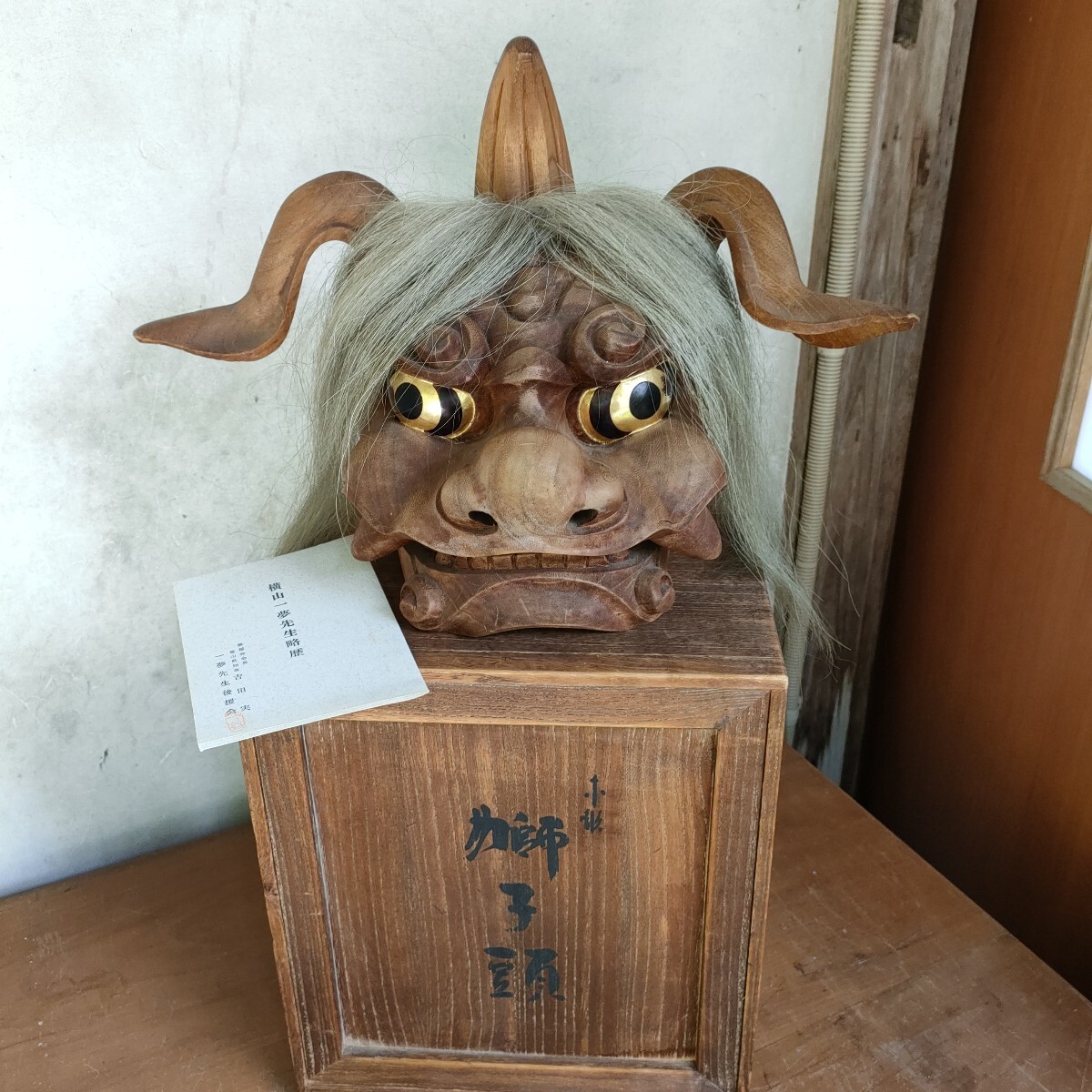 > 名工 横山一夢作 獅子頭 高さ28cm 重さ900g 共箱 富山県無形文化財 魔除け 神事 置物 美術品 彫刻 木彫り
