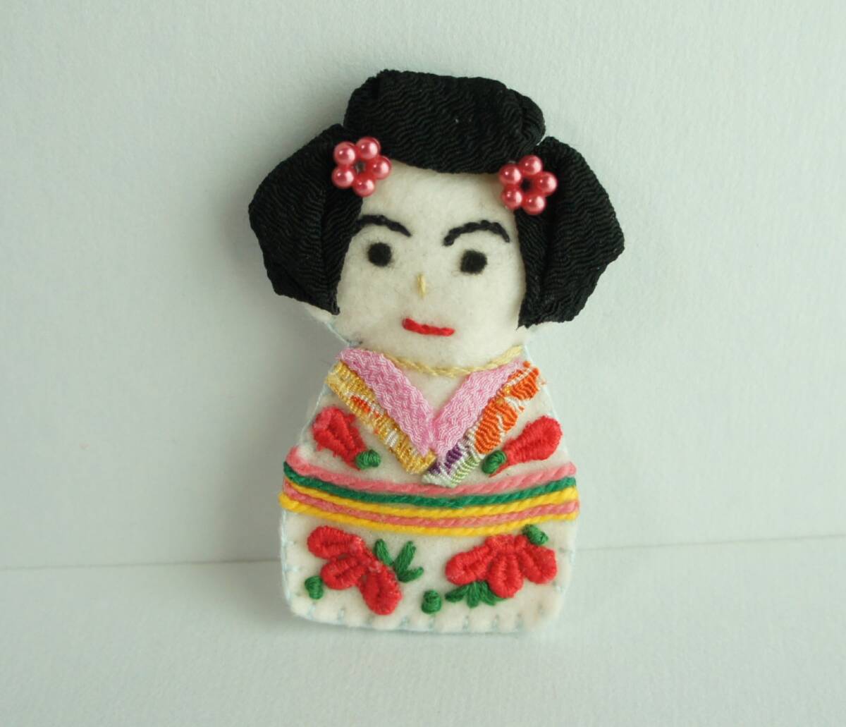 - ♪ ハンドメイド こけし ブローチ フェルト ちりめん ケミカルモチーフ 花型ビーズ使用 綿入り